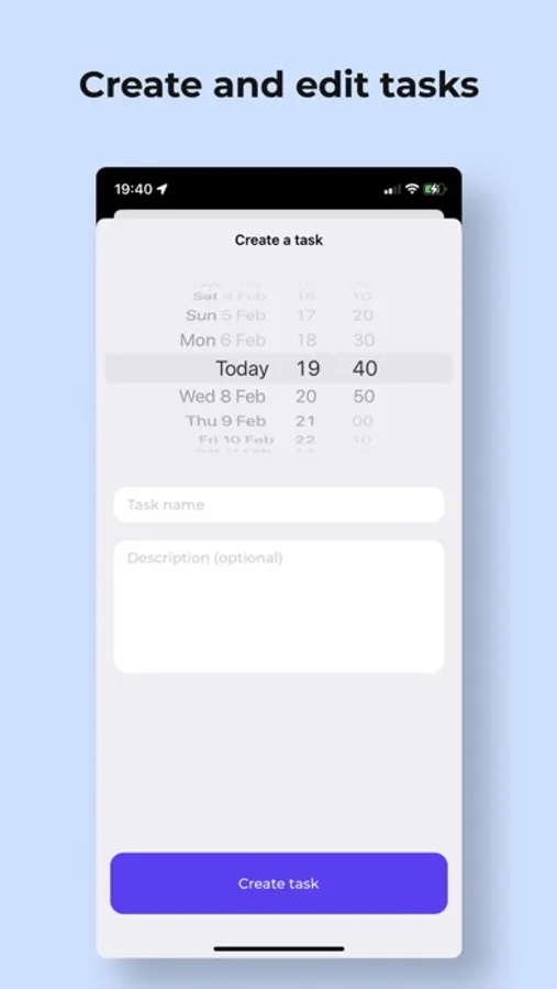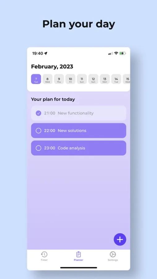 On the planner screen, you can create any number of tasks for 14 days in advance. They can be marked as completed, edited and deleted. You can always adjust something for yourself. The first failed task is visible on the timer screen.
