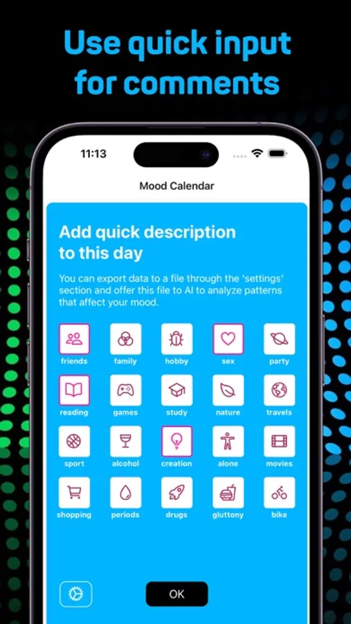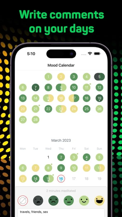 Be kind to your mind. «Day by day» helps to take a mindful approach to your mental health. Explore behavior patterns that may affect your mood by tracking them daily. Keep an eye on your moods and habits with an easy to use calendar. Build a stable meditation practice with the help of a simple timer and stats.