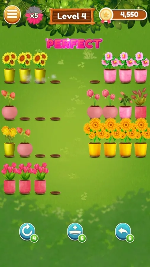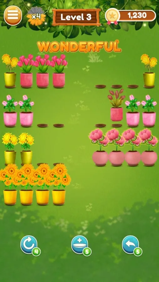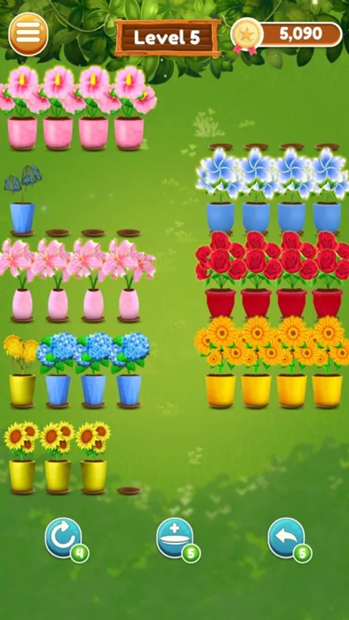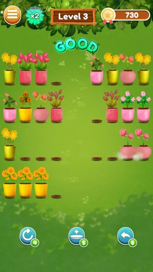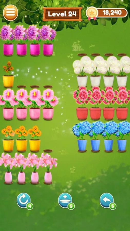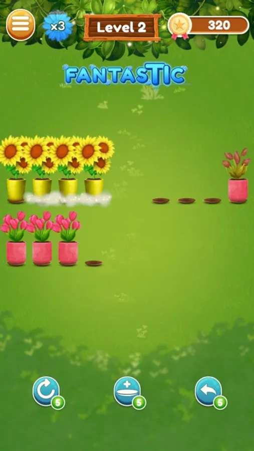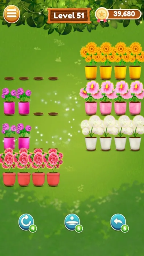 Use your finger to move the plant pots. You have to figure out your own strategy to solve the sorting puzzle. It's important not to get stuck, but if you do, you can always restart the level at any time.