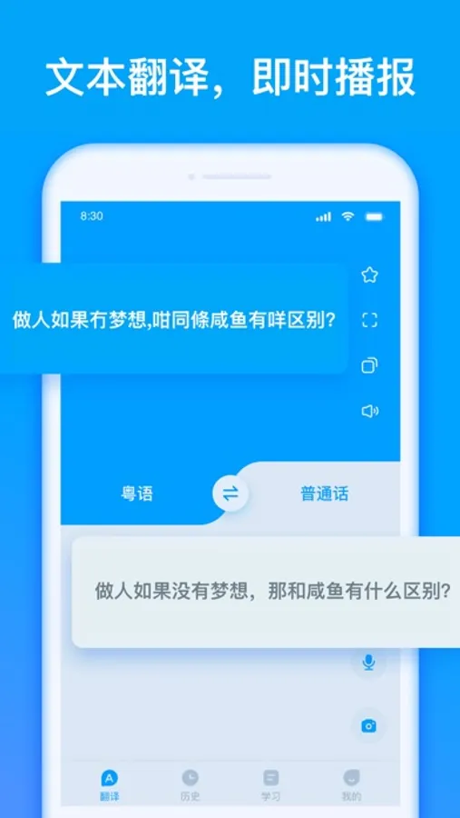 粤语翻译AI专家是一款专注粤语翻译和学习的利器,粤语学习资料、粤语翻译、粤语词典工具等。从粤语发音、词汇、对话循序渐进,由浅入深快速学说广东话。还有粤语翻译和发音词典,实在是旅行出行粤语学习随身必备App。