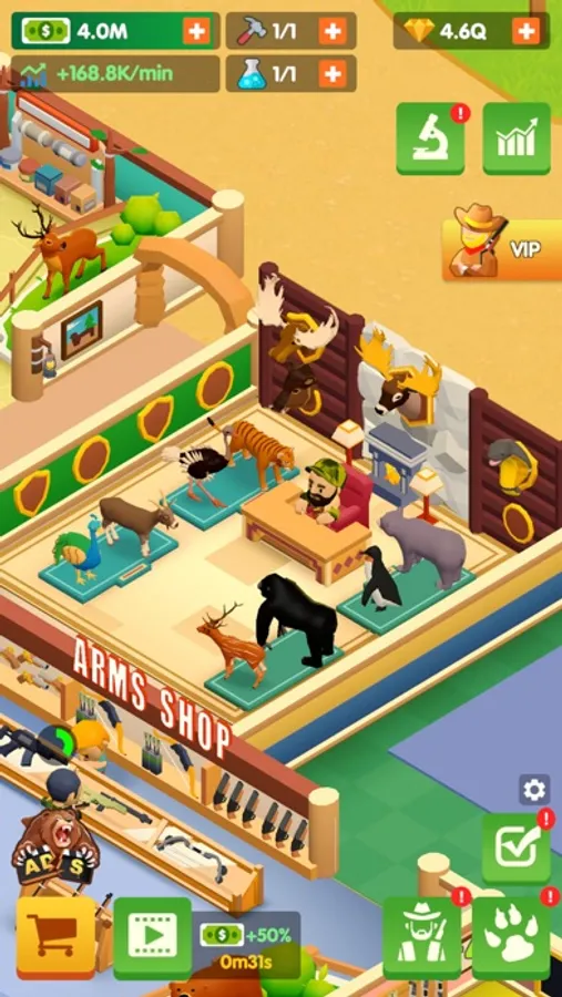 Upgrade shops to provide more varieties of goods and better services, increase the price of goods and capacity of customers. Build more hunting grounds to accommodate more customer and animals and gradually expand your business scale.