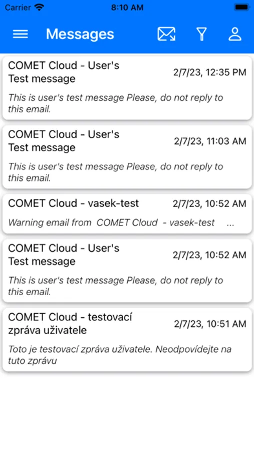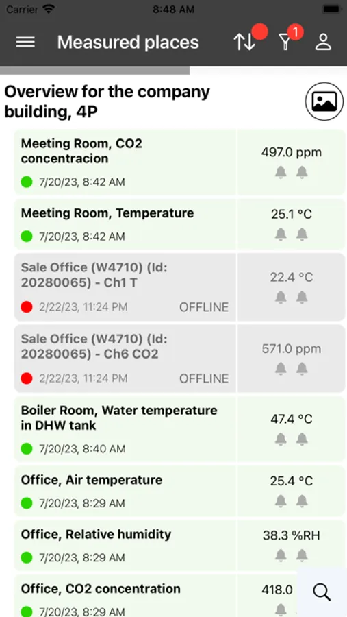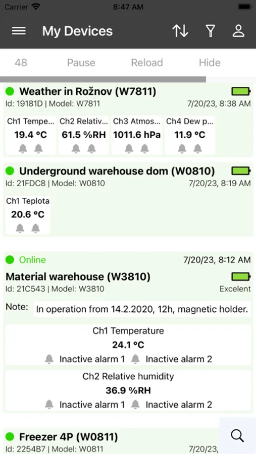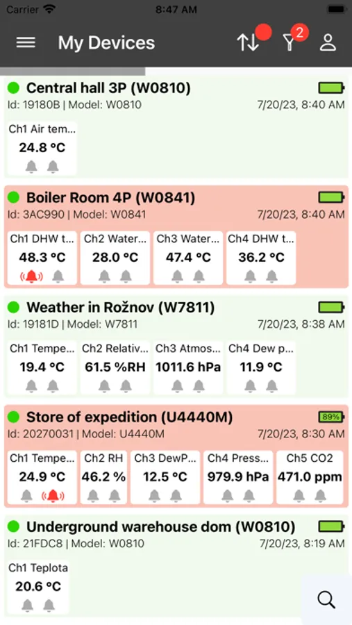 The app allows users to view cloud messages and receive notifications of alarms and other events. In the application, it is also possible to display an overview of the devices (My Devices) and measured places.