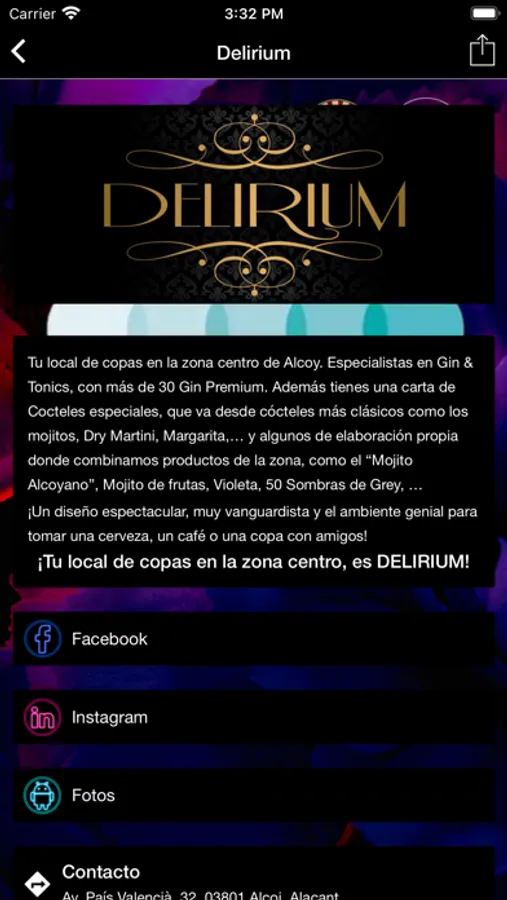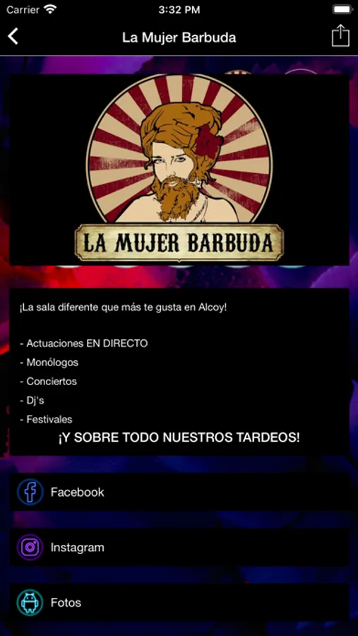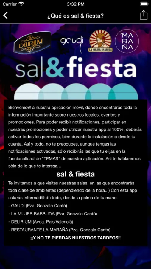 Sal y fiesta es la aplicación perfecta para salir de fiesta y visitar los locales de moda pertenecientes al grupo. Conoce de primera mano las novedades de Gaudi, La Mujer Barbuda, La Maraña Restaurante y Delirium. Ubicación geolocalizada de todos los puntos donde ir de fiesta. Compra de tickets y reservas de zonas VIP y otros servicios. Información de eventos organizados, próximos y pasados. Promociones y regalos exclusivos a través de la aplicación. Galería de fotos y videos Sesiones en descarga directa Y muchas sorpresas más..... Encuentra todo lo que necesitas en nuestros establecimientos para disfrutar de tu tiempo libre en ambientes muy diferentes y para todo tipo de público. Servicios de cafetería, sesiones de DJ, monólogos, actuaciones de grupos en directo, fiestas temáticas especiales durante todo el año, y todo ello amenizado con la mejor música. Mantén el contacto directo con nuestro equipo, reserva nuestros servicios, y consigue descuentos y regalos exclusivos desde la palma de tu mano. ¡¡Descárgatela ya, y no dudes compartirla con todos tus contactos, SAL y FIESTA!! Todo desde la palma de tu mano...