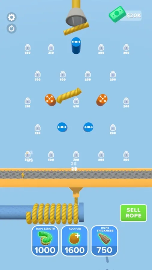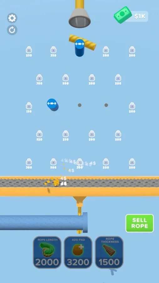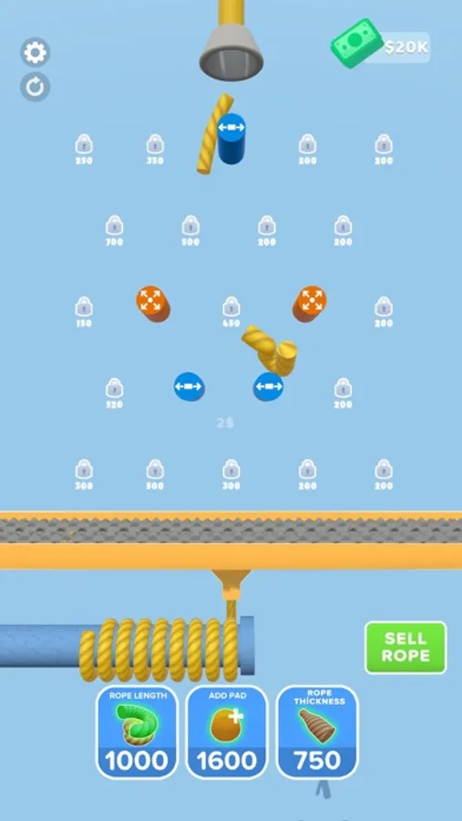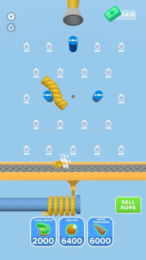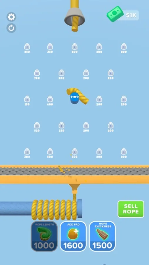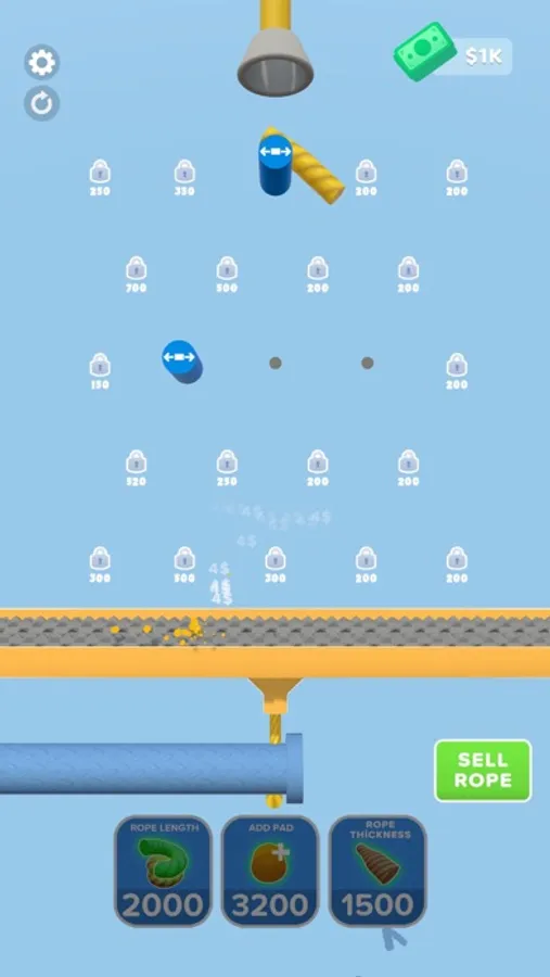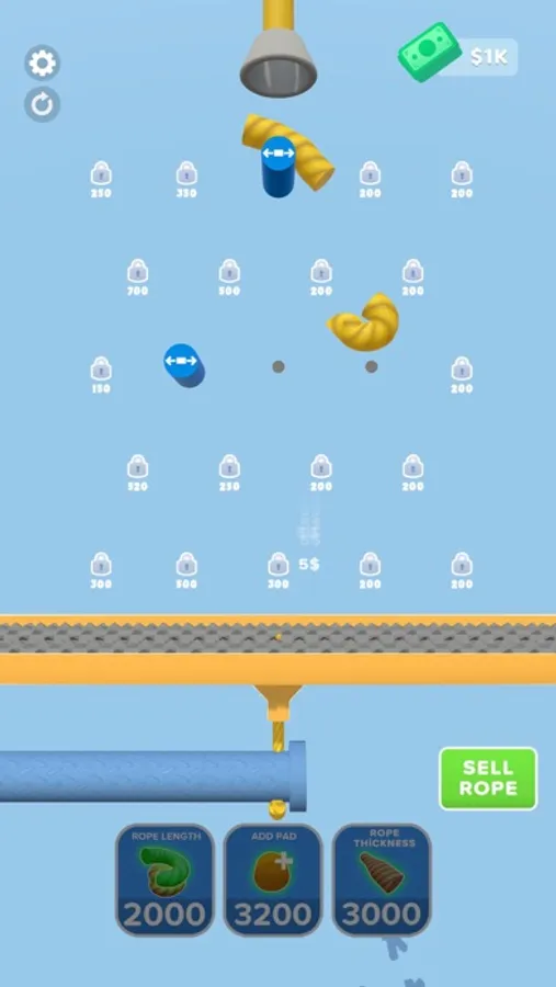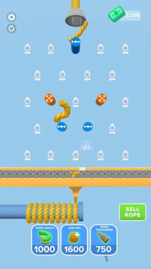Move and place the pins to get bigger and bigger ropes. Grind and reel them to sell.