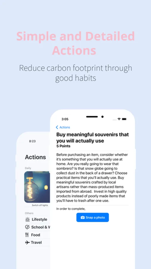 People of today believe in technology, and we believe technology can also help mitigate the problem of climate change. This app includes dozens of essential actions that help you to be aware of climate change. An interactive tree is visible on the home page. As you complete more actions, it grows. This visualization allows you to experience tangibly and profoundly what you contribute to a better environment. Furthermore, you can take a picture when they complete an action, which serves as a record of your contribution. A section on the front page also shows a random action completed in the past, reminding your past accomplishments.