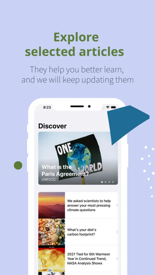 Beyond actions, CO2 Aware also provides abstracts and links to high-quality news articles from renowned sources that allow you to acquire environmental knowledge.