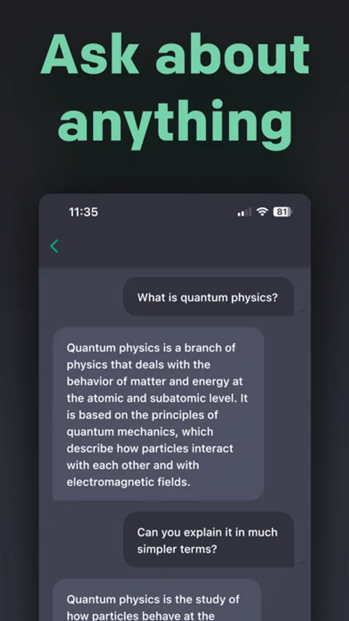 With the revolutionary AI used in this app, ask whatever is on your mind. You can ask about the meaning of life, or a simple explanation for the problem you have been facing in your university classes, or ask the artificial intelligence to crack a joke for you. You can ask for a copy for the landing page you are designing, or ask the AI to fix your grammatical problems or improve the text if you’re learning English. You can ask how you should answer the person you are chatting with on the dating apps for increasing your chances. The sky is the limit. Download the app today and get onboard the AI revolution!
