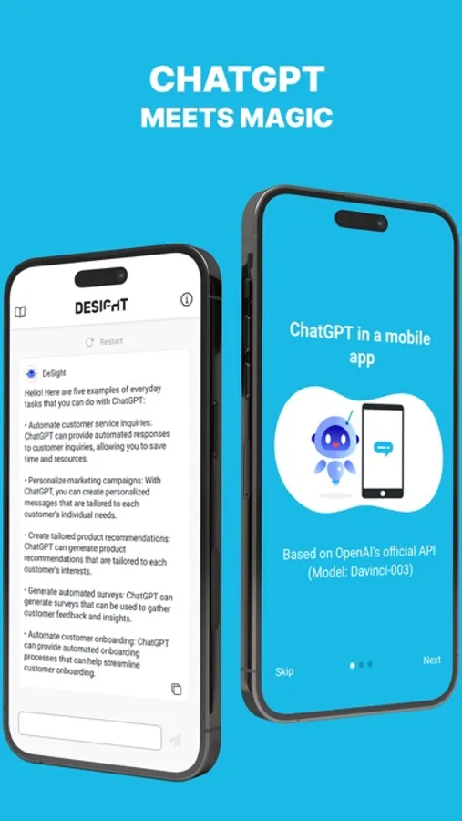 *Important to know: DeSight receives its data via OpenAI's API / ChatGPT in the Davinci 3 model, which may occasionally result in incorrect or biased responses. We recommend that you check the accuracy of the model's responses. In addition, the model can remember up to 750 words from the current conversation, but information beyond that is not stored. When using the app, all data and information is retrieved and output via an API from OpenAI / ChatGPT servers. The complete privacy policy and all details on handling your data can be found at https://openai.com/privacy/.