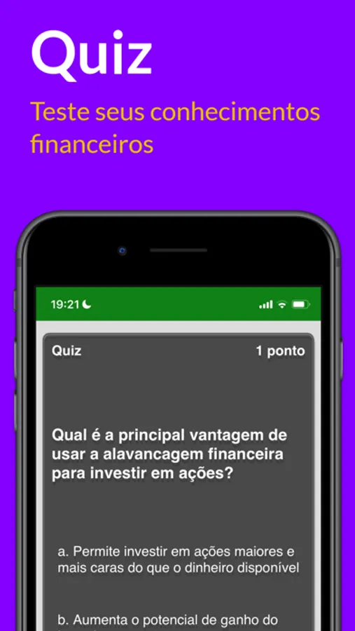 Além disso, você pode avaliar suas alocações de capital com base no método ARCA do Primo Rico, testar seus conhecimentos sobre os conceitos discutidos no livro "Pai Rico, Pai Pobre" com nosso quiz interativo e ser avaliado em tudo o que você faz no aplicativo.