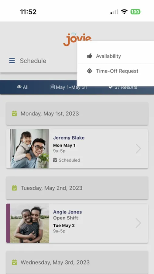 The My Jovie app is available to all of our Jovie families to help manage the childcare challenges of work and family life. Visit jovie.com, to get started with Jovie™ today.