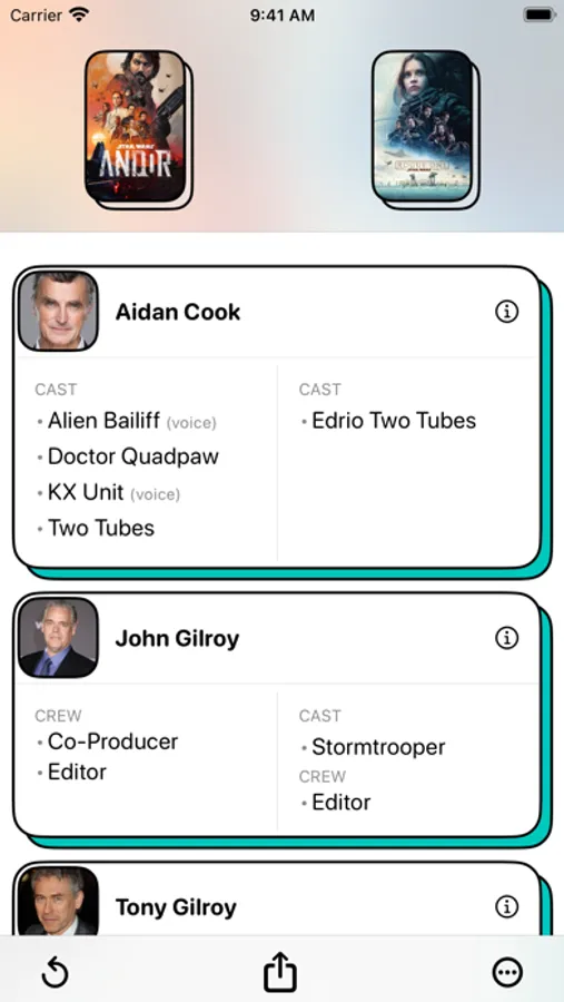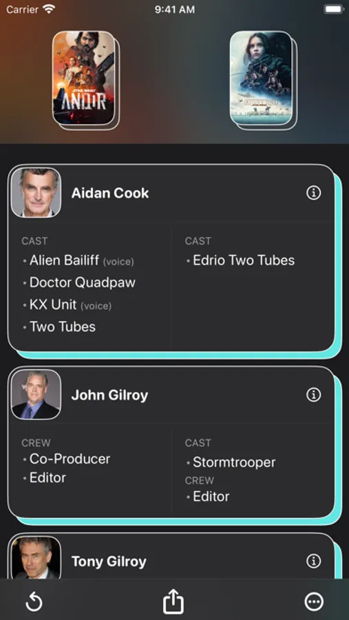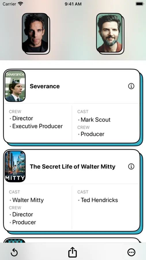 Find connections between your favorite movies, shows, actors, directors, and more. By searching two movies, shows, or people, ScreenCred takes a unique approach by only showing you the common cast, crew, and credits between the two. Share links to what you find with your friends.