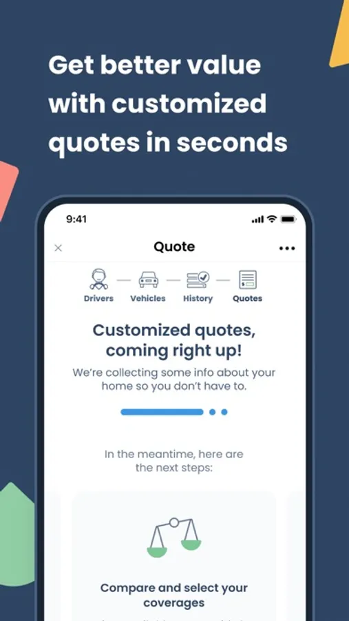 In seconds, you can also customize, compare, and shop auto, home, renters and condo insurance quotes, right in the app -- plus all kinds of other policies like umbrella, second home, boat, bike, RV and more by phone.