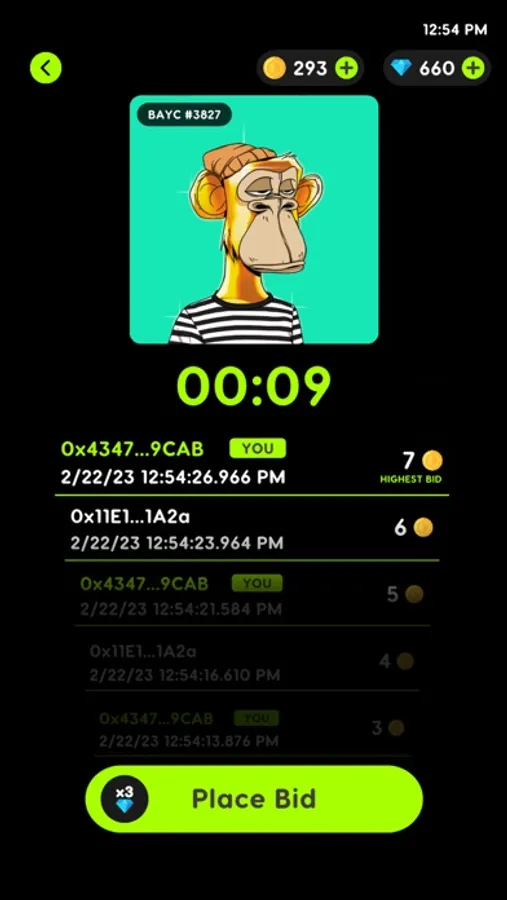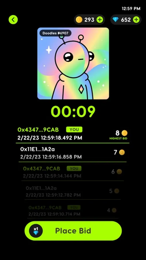 3. Each bid will increment the value of the auction by one (1) coin ($0.01), and resets the countdown timer to 10 seconds. Higher value auction items may require multiple gems per bid.