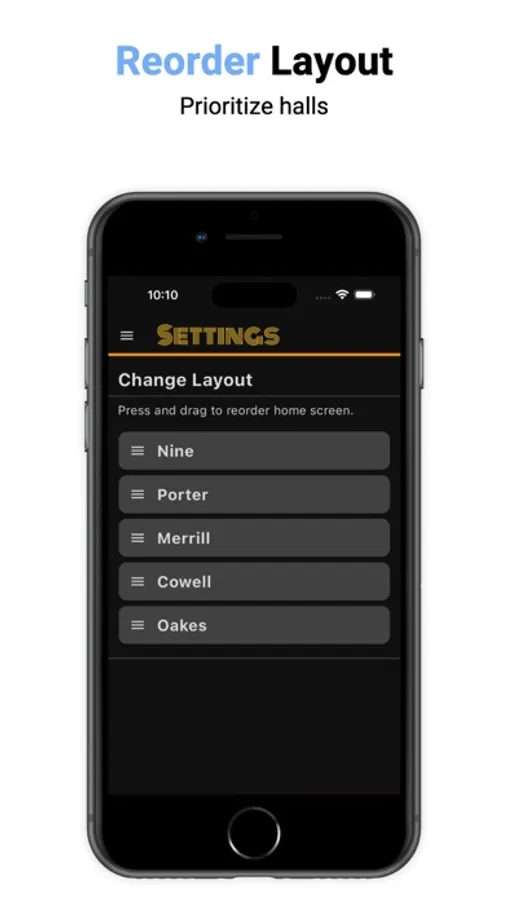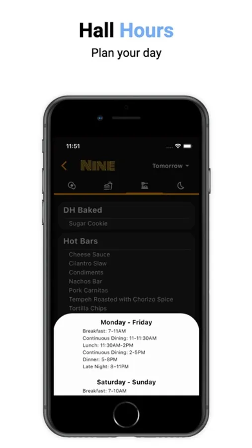 Includes a summary page for each college's main food, a detailed menu for each individual college, ability to see menus for future dates, an hours info tab, and a remaining slug points calculator.