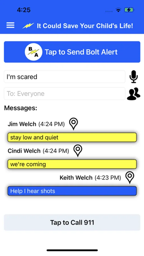 • Every message includes the sender's location. BoltAlert provides maps so you can see where they are, and get help to them fast.