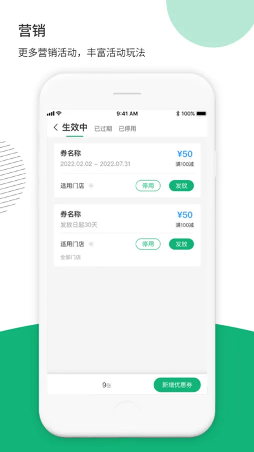 营销管理:优惠券、特价商品、会员、订单满减、客户积分、储值赠送、短信通知。