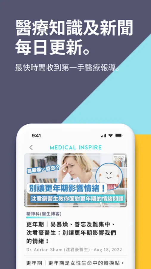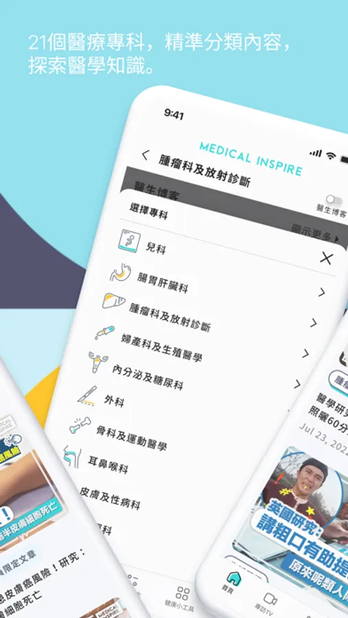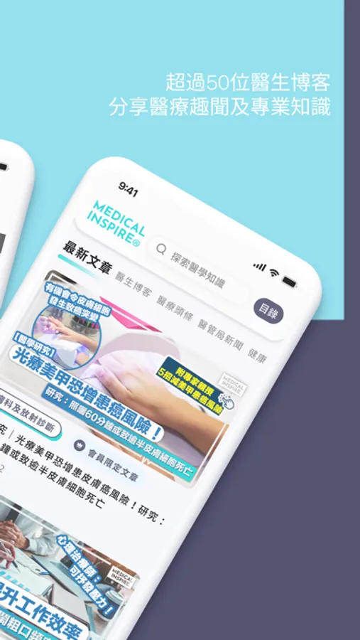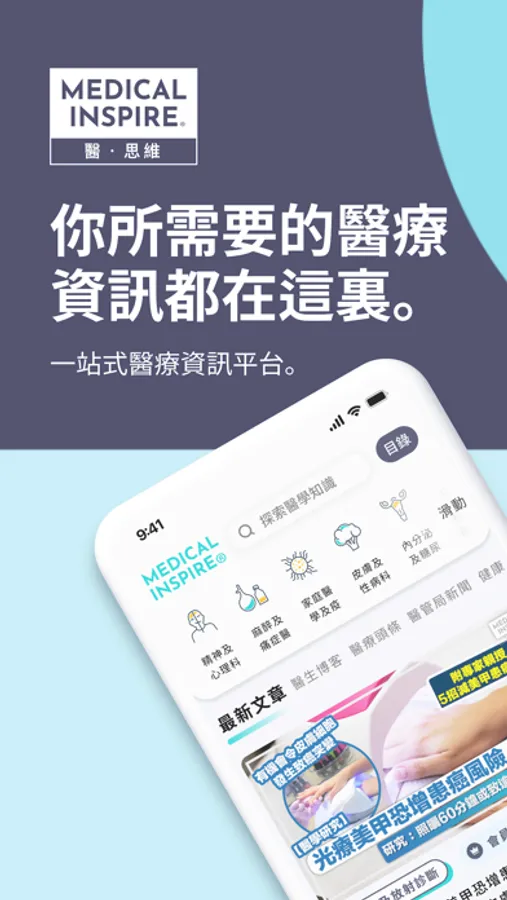 《Medical Inspire 醫.思維》App提供香港及海外多元化最新健康資訊,包括專業醫療、食安、養生、飲食營養、運動健康等內容。