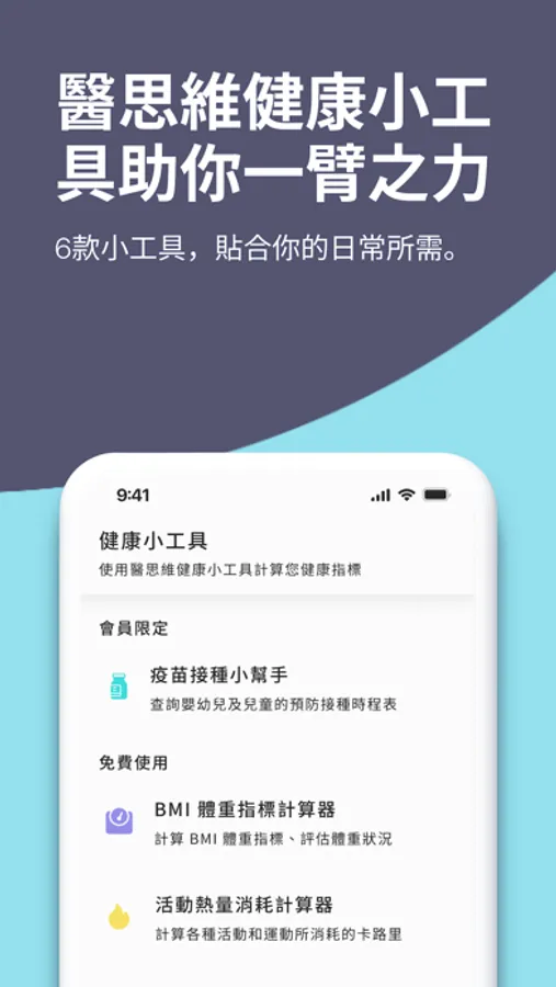 醫學工具 - 內附多種實用健康小工具,無論係想知個人BMI指數、熱量計算,抑或女性經期計算,甚至準媽媽預產期、寶寶記錄小助手通通都有,等大家輕鬆享受健康人生!