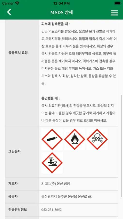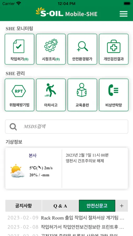 S-OIL 안전보건환경 관련 자료를 조회하고 활용하며 지역별 실시간 기상예보와 특보 공유를 위한 어플리케이션 입니다