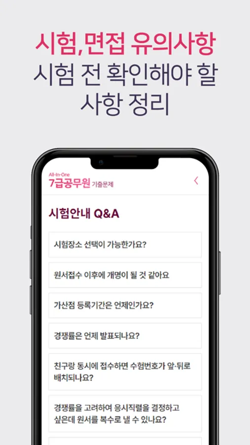 7급 공무원 시험 관련 자주 묻는 질문과 문의사항을 한 번에 모아 궁금증을 앱 하나로 해소할 수 있도록 제공하고 있습니다.