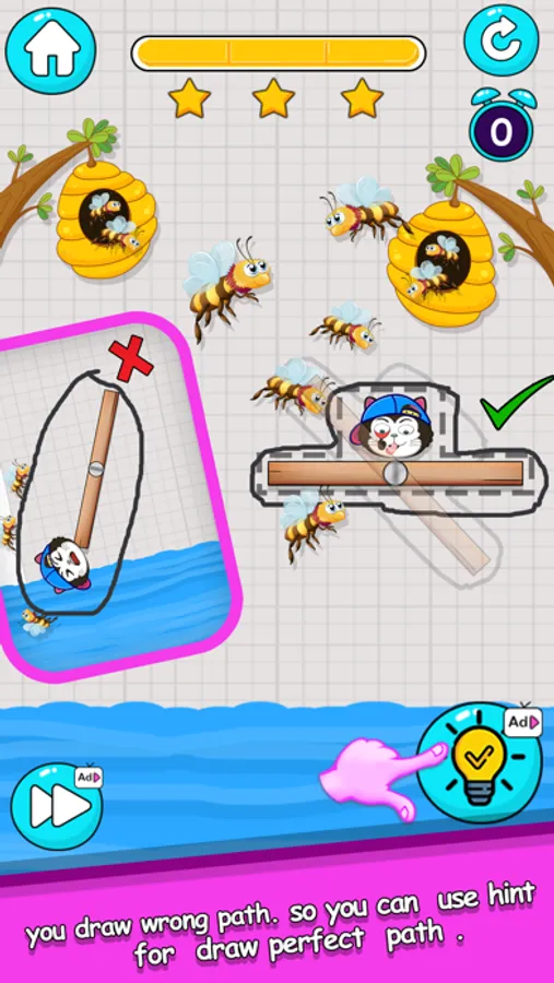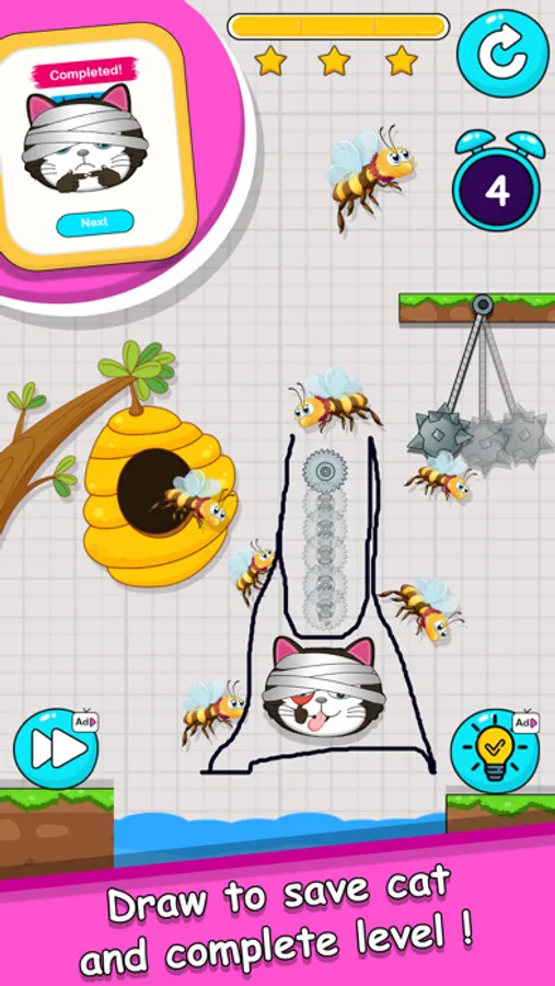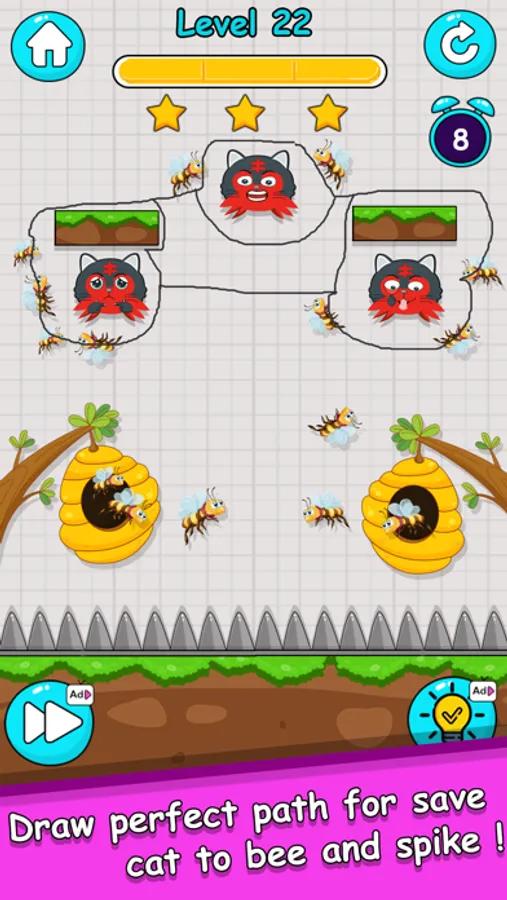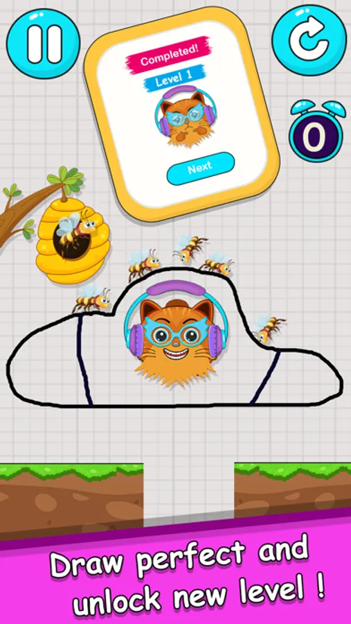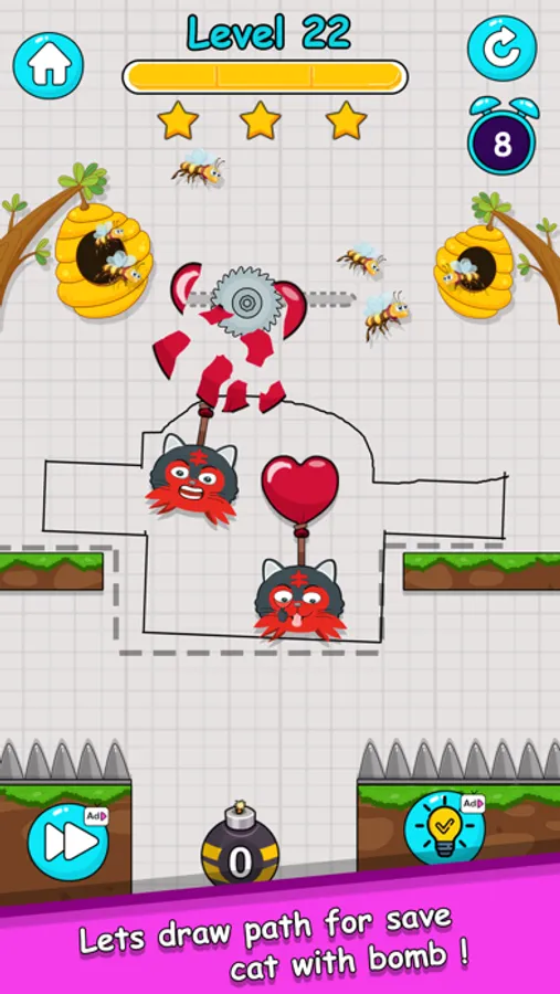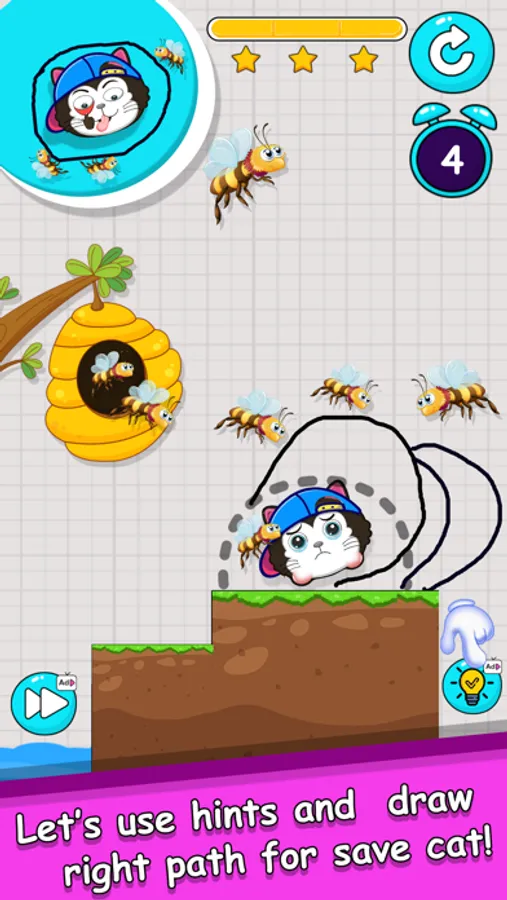 Save the cat: Draw To Save is a draw save puzzle games. You draw one line with your fingers to create walls that protect the cat from attacks by bees in the hive. You need to draw to save the cat with the painted wall for 12 seconds during the attack of the bees, hold on and you will win the game. Use your brain to save the cat.