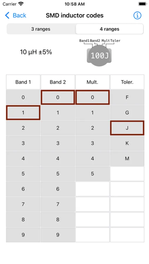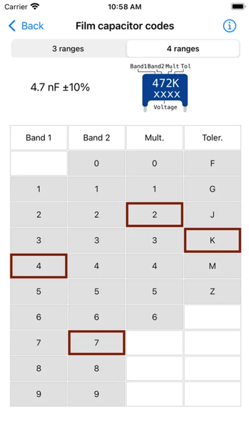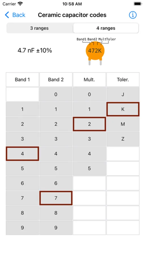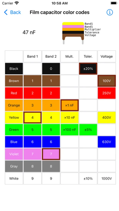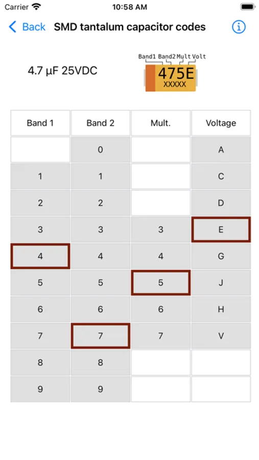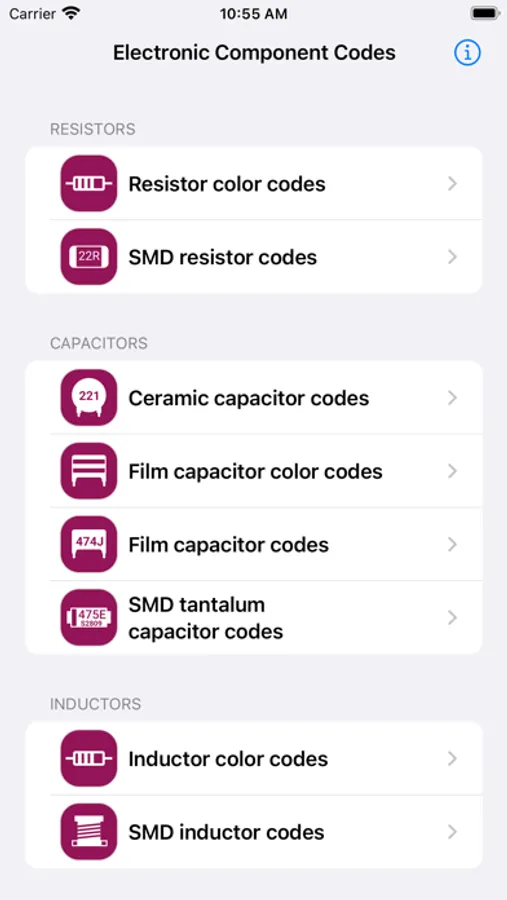 Application for reading codes for resistance, capacitance and inductance of electronic components.