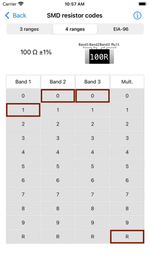 The application also checks the entered value against E-series E6, E12, E24, E48, E96, E192, depending on the accuracy.