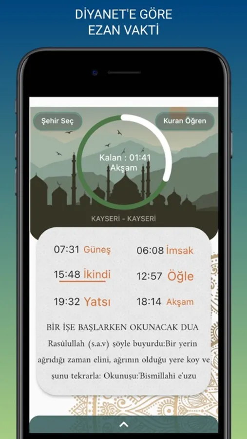 Ezan vakti uygulamasının bir diğer özelliği ise günlük olarak yapılması gereken duaları ezan vakitlerinin altında zamanla değişerek sizlere göstermektedir. Günlük duaları Türkçe anlamları ile birlikte okuyabilirsiniz.