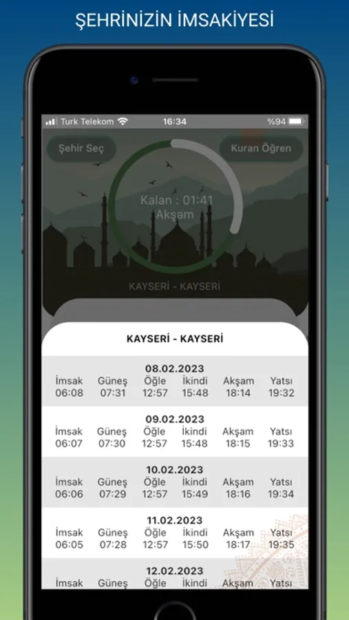 Ezan vakti uygulaması size kentin ve ilçenin 1 aylık imsakiyesini de vermektedir. Bu nedenle Ramazan imsakiyesi olarak kullanabilirsiniz. İftar saatlerini öğrenebilirsiniz. Ramazan'da imsak ve iftar saatlerine göre değişen Güneş'in hareketini takip edebilirsiniz. 1 aylık Ramazan imsakiyesi için alt menüyü yukarı kaydırmanız yeterlidir.