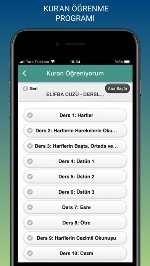 Ezan vakti uygulaması ile Kuran öğrenebilirsiniz. Bunun için sizlere Elifba derslerini sunduk. 28 derste Kur'an öğrenmeye başlayabilirsiniz. Sesli elifba derslerinde harflerin çıkış seslerini tekrar edip alıştırmalar yapabilirsiniz. Önce siz okuyup ardından sesi dinleyebilirsiniz. Böylece 28 dersi tamamladığınızda Kuran okumaya başlayacaksınız.