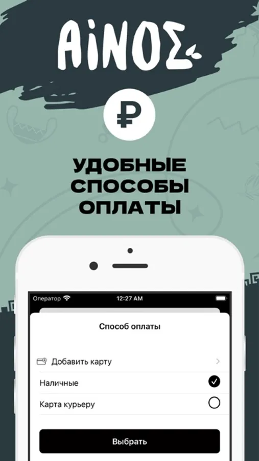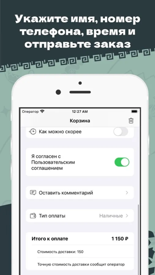 Выберите способ оплаты: Наличными или картой. Примите правила оплаты и нажмите кнопку “Заказать”.