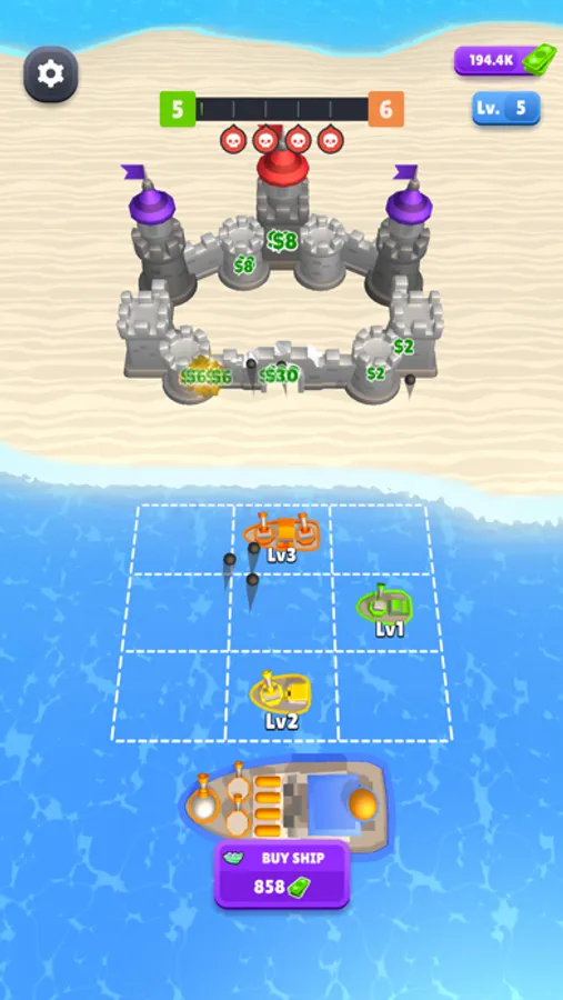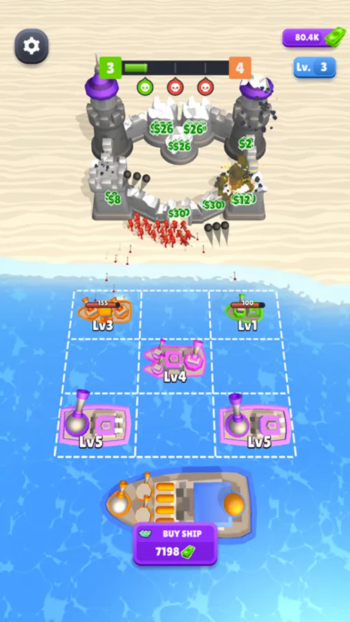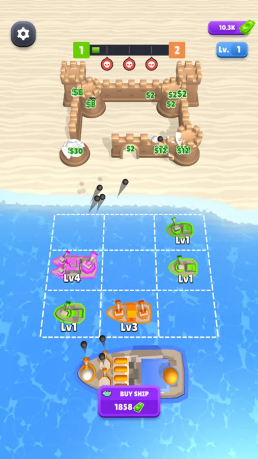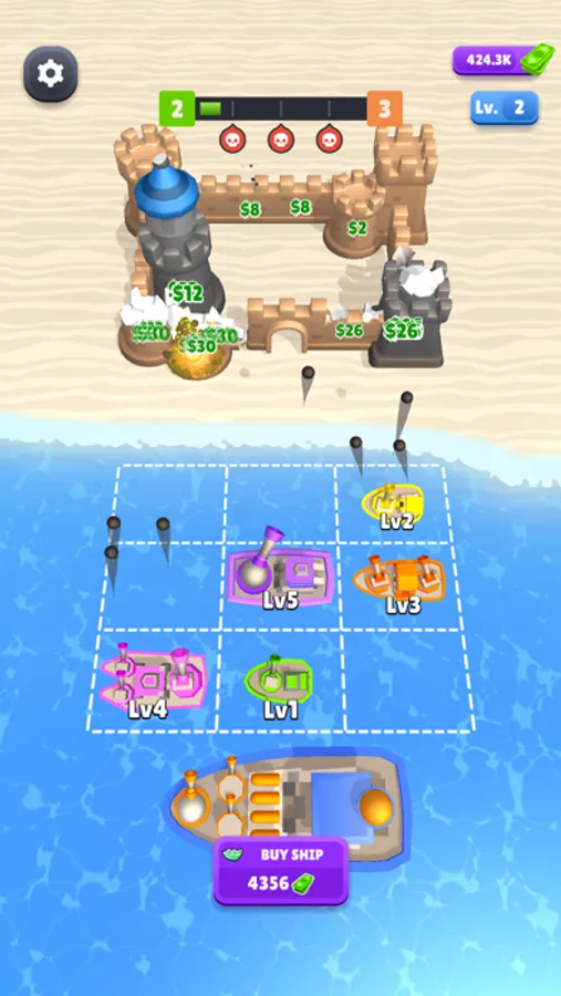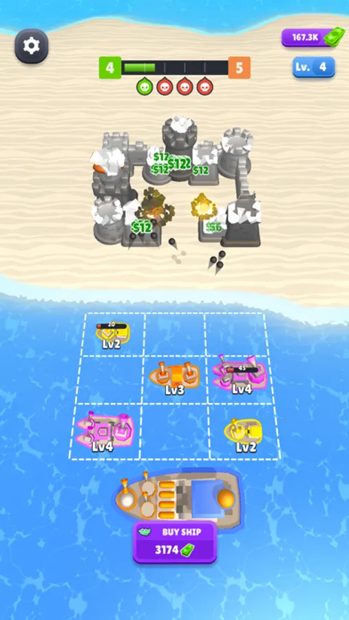 Buy ships and merge them to have higher level ships. Set where your ships should be fired with the crosshair. They are waiting for your command.