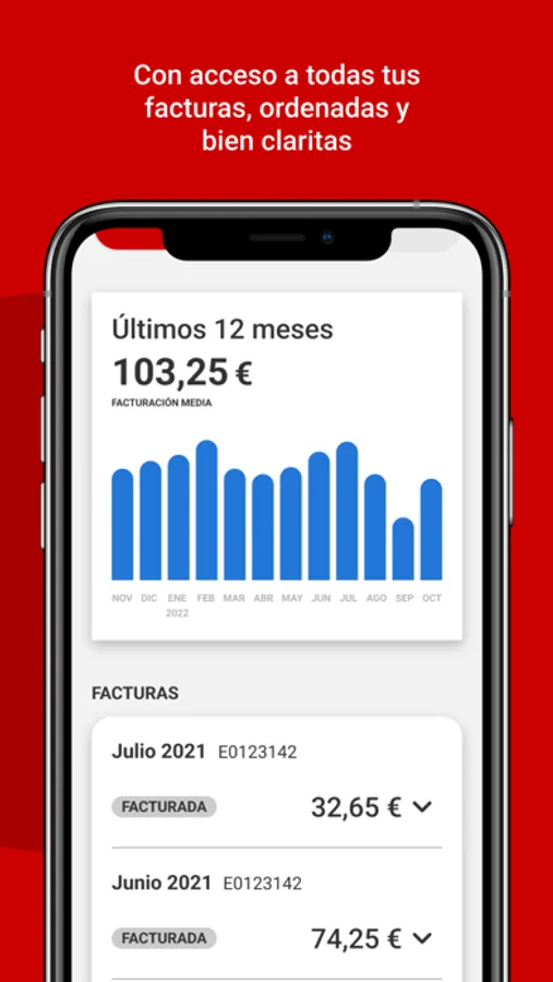 Podrás ver un listado de todas tus facturas, ver un detalle de las mismas, descargarlas en PDF o incluso compartirlas por Whatsapp o email.