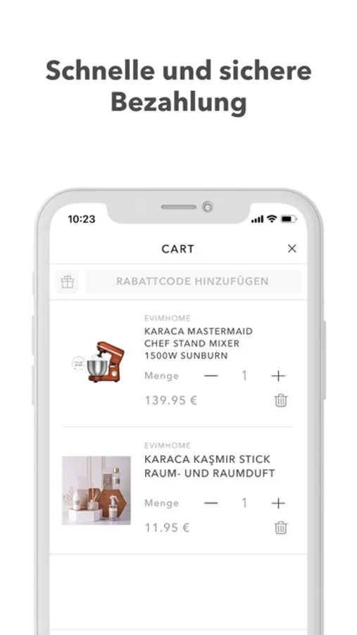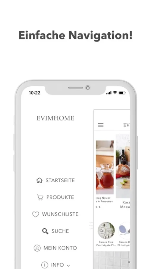 Downloade jetzt die kostenlose App von EVIMHOME und stöbere in Ruhe durch unser gesamtes Sortiment. Von Geschirr und elektrischen Haushaltsgeräten, über Heimtextilien und Teppichen bis zu Accessoires ist alles dabei. Hierbei kannst du erweiterte Such- und Filterfunktionen anwenden, um z.B. spezielle Produkte von namhaften Herstellern leichter zu finden oder deine Lieblingsprodukte in deiner Favoritenliste ablegen, damit du immer alles im Auge behältst. Durch eine übersichtliche Benutzeroberfläche helfen wir dir alles was dein Herz begehrt zu finden.