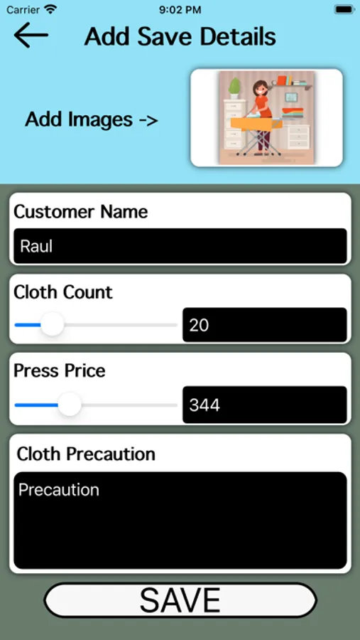 Once the category is chosen, the user can add the details of clothes they have pressed.