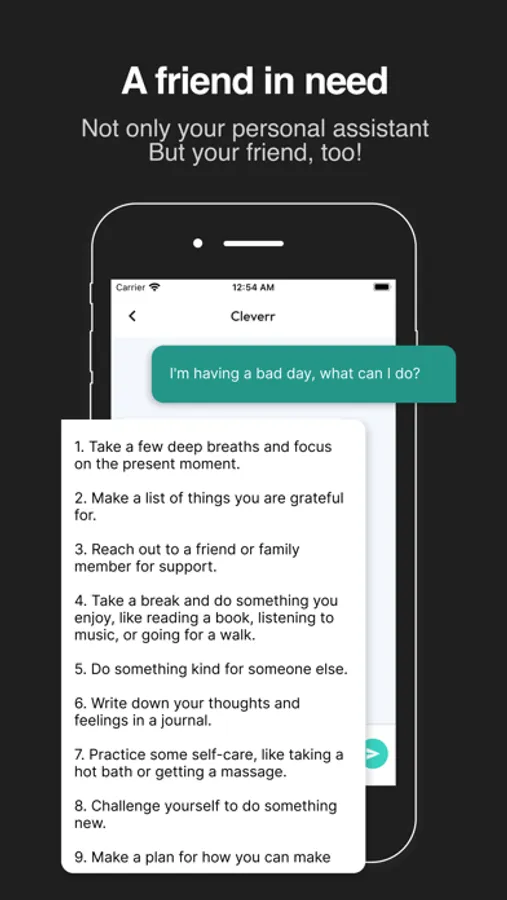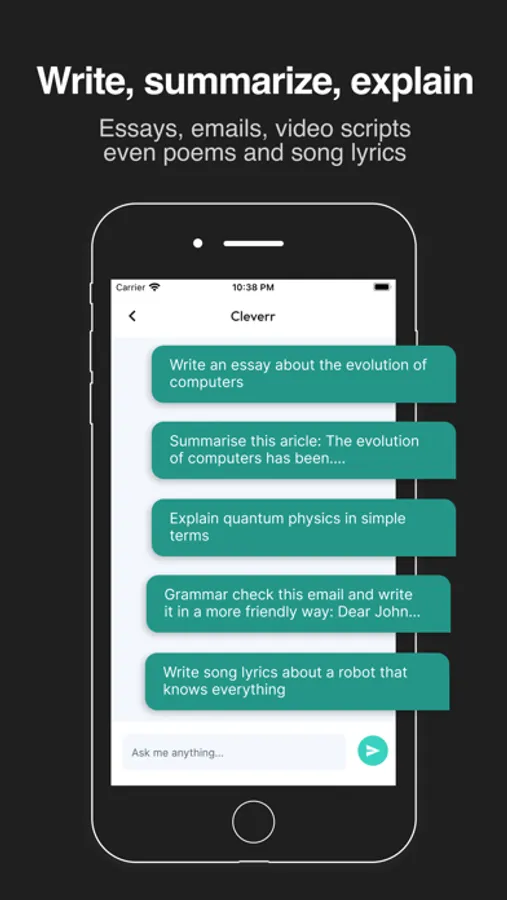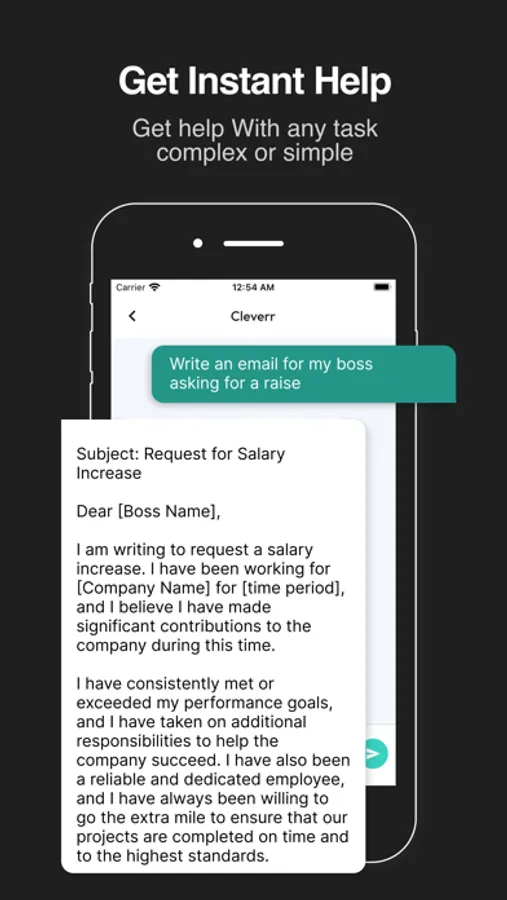Additionally, Cleverr Chatbot AI Assistant is the perfect tool for anyone who wants to improve their writing skills and write more effectively. With advanced AI-generated algorithms, this app provides grammatically correct and well-structured writing that can help you communicate your ideas more clearly. Whether you're working on a school essay, writing a business email, or simply jotting down notes, Chatbot AI Assistant has everything you need to get your thoughts down on paper.
