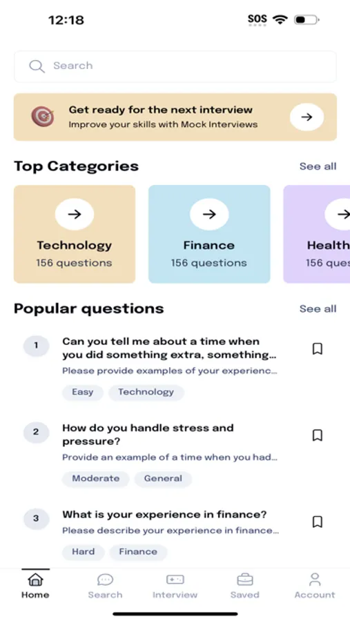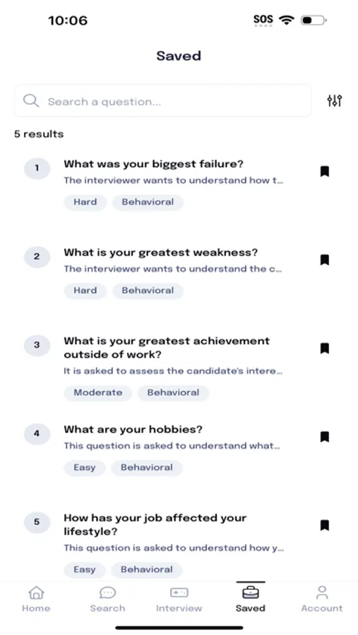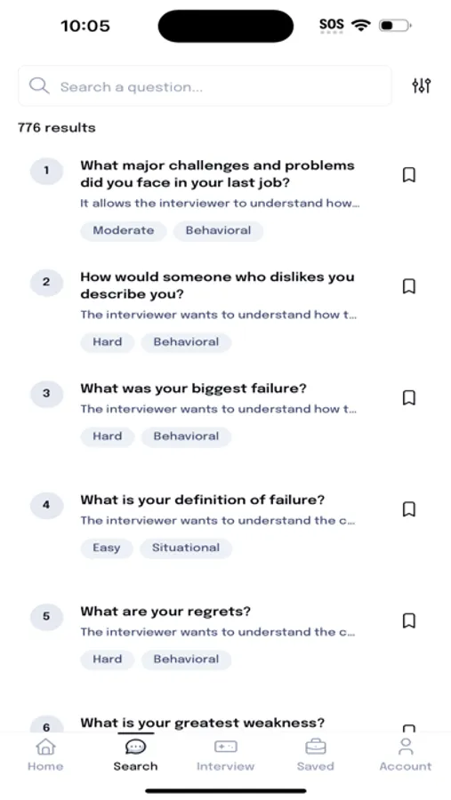 Elevate your interview skills with practice using our Interview Questions and Answers app. With mockup interviews, you'll be able to practice your answers and perfect your technique. Filter your questions by easy, moderate, or hard and get ready for your next interview with confidence.