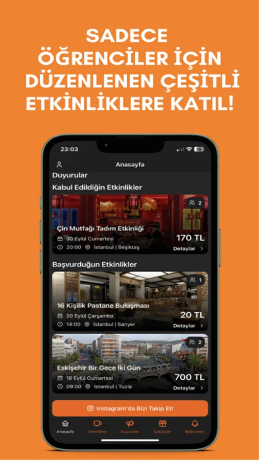 Üniversite hayatının stresli dönemlerinde bile Gidelim, öğrencilere rahatlamaları ve eğlenmeleri için birçok fırsat sunuyor. Öğrenciler arasında arkadaşlık kurmak ve aynı ilgi alanlarına sahip kişilerle tanışmak artık daha kolay. Gidelim, öğrencilerin üniversite etkinliklerine katılmasını, gezi turları düzenlemesini ve okul projelerinde bir araya gelmesini destekliyor.
