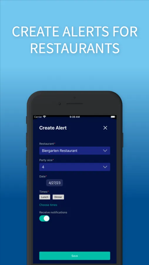 The app allows you to create an alert set for a specific date, party size and flexible hours to maximize the chance we can find you a spot.