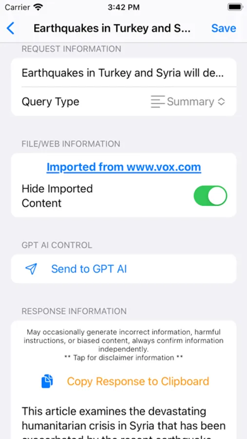 Easily send text files, PDF documents, web pages, and your own custom questions to AI! Get a summary, bullets, arguments in the text, questions you can ask about the text, or anything else you can think of asking.