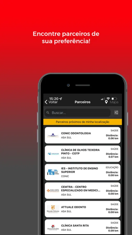 Busca de parceiros através do geolocalizador, filtragem personalizada para as buscas de empresas parceiras, acesso ao cartão virtual para utilizar os descontos, acesso a notícias e além do SAC para atendimento.
