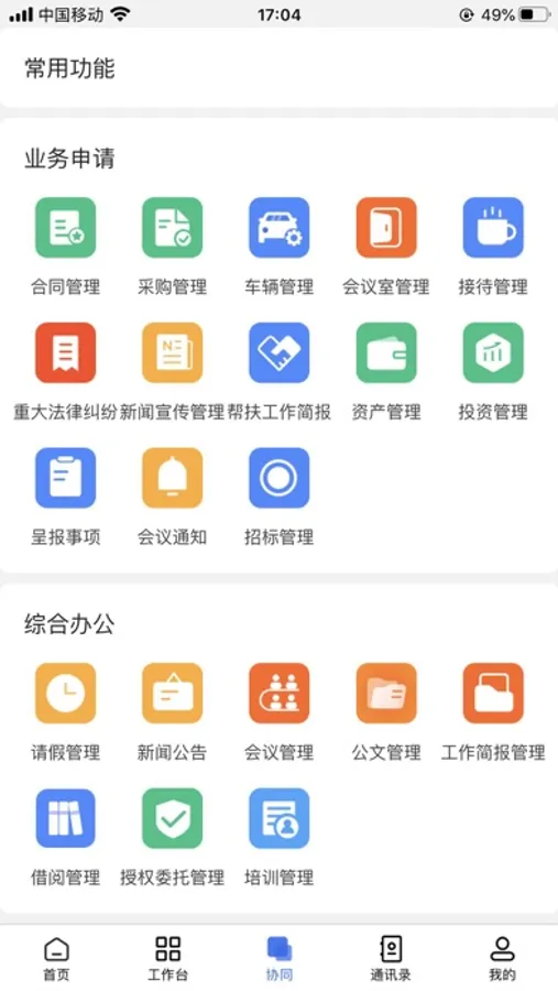 一体化管控平台,集成了合同、采购、招标、资产、用车、会议、接待、请假、公文、用印、借阅、培训、通信录等众多功能,是为集团企业提供的高效便捷的办公软件。
