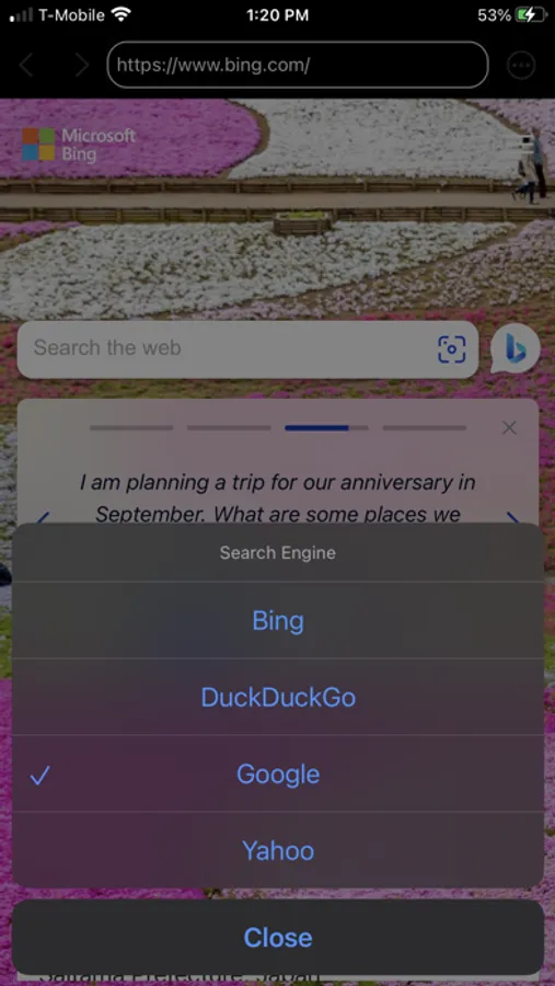 Choose Bing, DuckDuckGo, Google or Yahoo as your search engine
