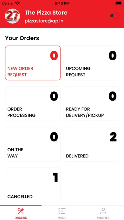 - View Orders via status (Pending, In Kitchen, On Delivery, Delivered)