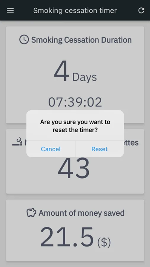 ・If you are unable to resist and smoke a cigarette, you can reset the timer by tapping the reset icon in the upper right corner of the screen.