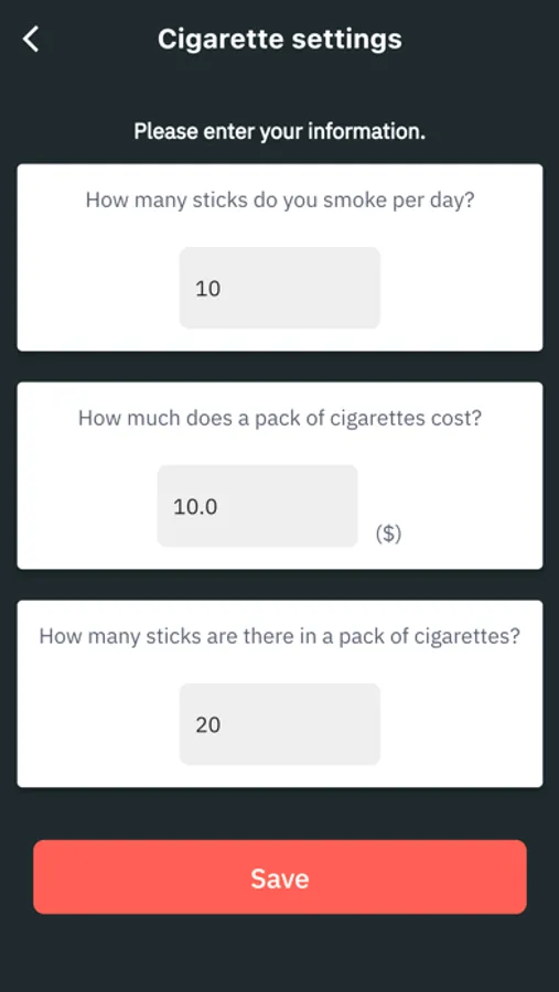 ・After starting the app, set the "number of cigarettes smoked per day," "price of a pack of cigarettes," and "number of cigarettes in a pack".