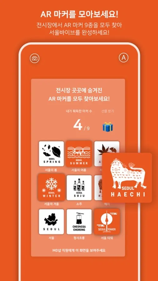 - AR 마커는 갤러리광화 'SEOUL VIBE' 전시장 공간 내에서 찾을 수 있습니다.