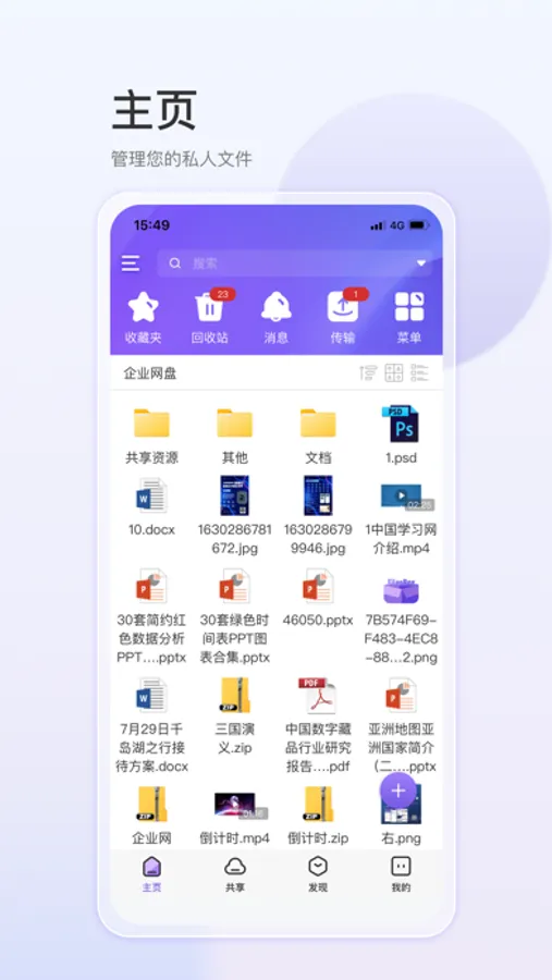 支持文件、文件夹的常规操作,如新建、删除、重命名、复制、移动、分类、粘贴、属性、上传、下载、排序、视图等;以及文件的快捷键、打标签、写备注、置顶、高级检索、收藏夹、回收站、最近文档、打印等。