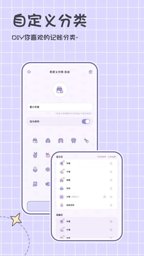 【自定义分类】支持记账分类设置显示、隐藏、常用、调整顺序,还可以DIY属于自己的独特分类;