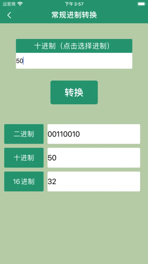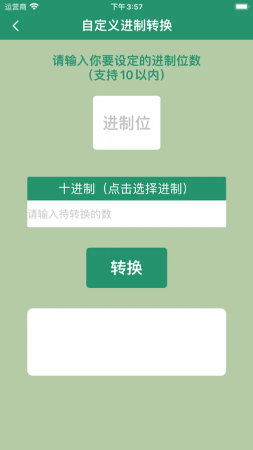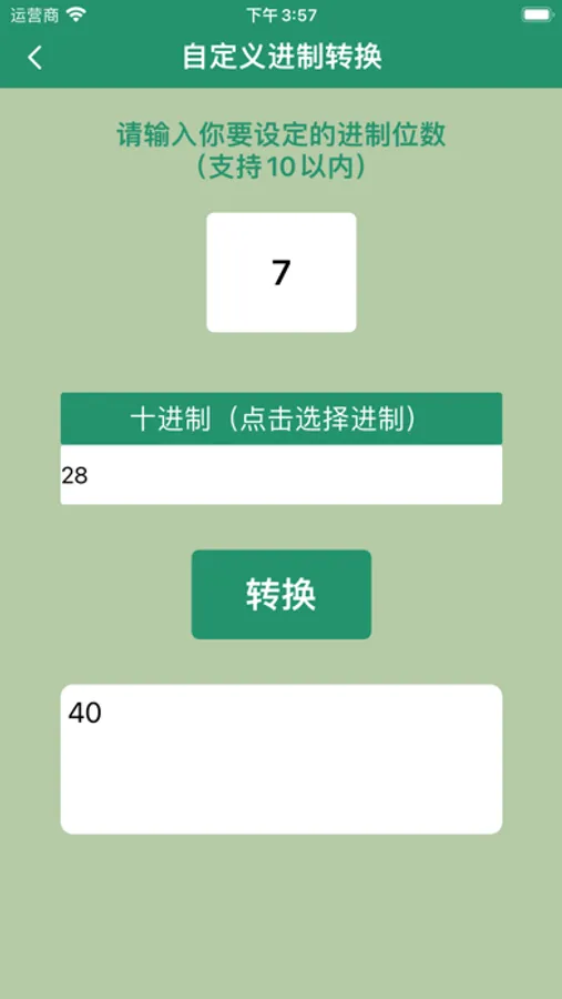 本应用可以帮助用户在二,十,十六进制之间快速转换,同时还支持用户自定义进制数,是计算的好帮手。